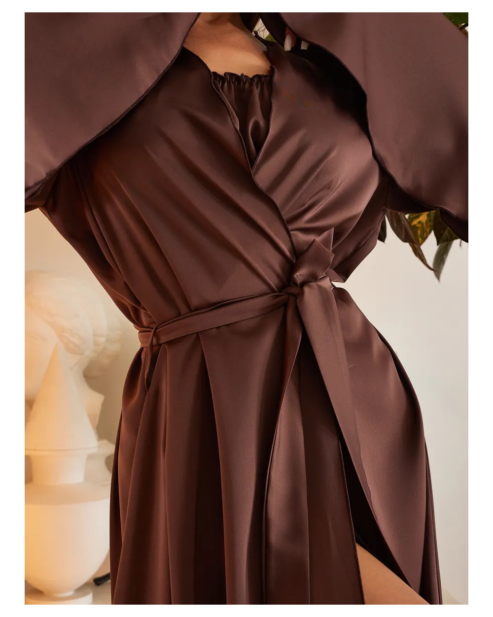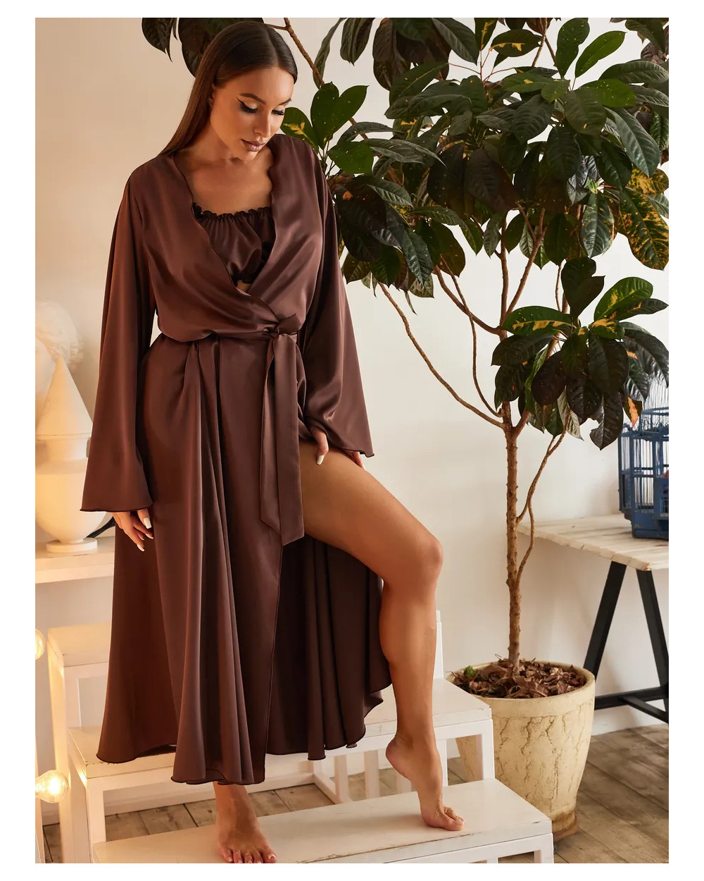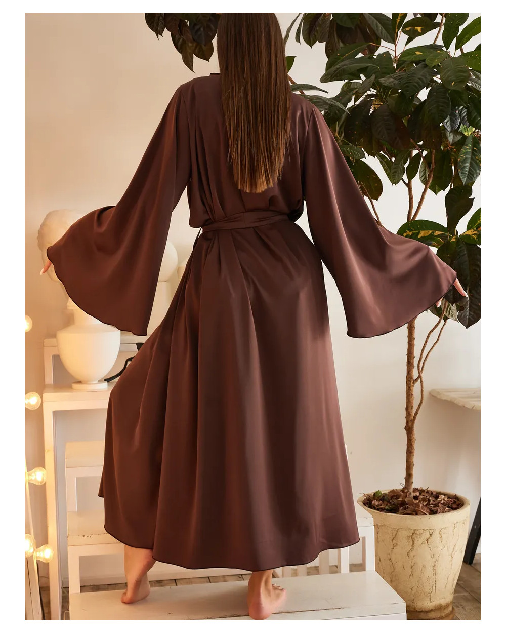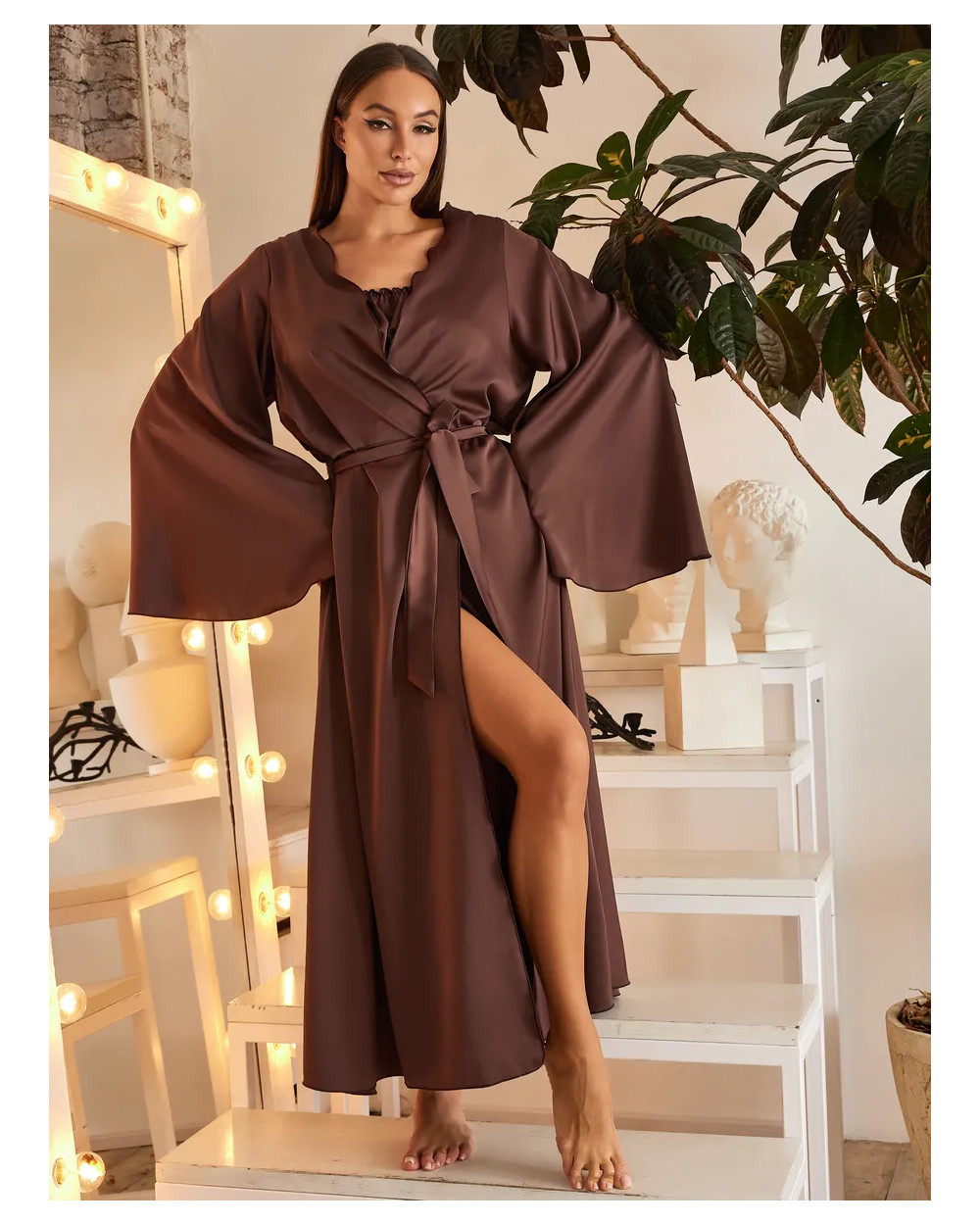 Lūk, grezns kimono stila halāts no dārgmetāla satīna, kas kļūs par īstu dārgakmeni jūsu garderobē. Šis garais satīna halāts ietērps jūs maigumā un komfortā. Izsmalcinātais kimono piegriezums ar aizdares aizdari izcels jūsu sievišķību un graciozitāti. 139 cm garā mantija ir ideāli piemērota garām meitenēm, un kabatu trūkums rada minimālisma un elegances siluetu. Šis halāts būs lieliska izvēle jūsu mājokļa komfortam. Tā mīkstais zīdainais audums nemuļķojas un saglabā nevainojamu izskatu visas dienas garumā. Pateicoties tā daudzpusībai, kimono halāts būs piemērots visiem, kas novērtē komfortu un stilu. Iedomājieties, cik patīkami būtu pēc dušas ietērpties šajā mīkstajā halātā, baudot mieru un klusumu. Tas būs jūsu uzticamais sabiedrotais atpūtas brīžos un sniegs greznības un mājīguma sajūtu. Klasiskais dizains bez rakstiem ir piemērots jebkuram gadījumam, un bagātīgā krāsa piešķirs jūsu tēlam eleganci. Šis halāts nav tikai apģērbs, tas ir īsts pašaprūpes rituāls.