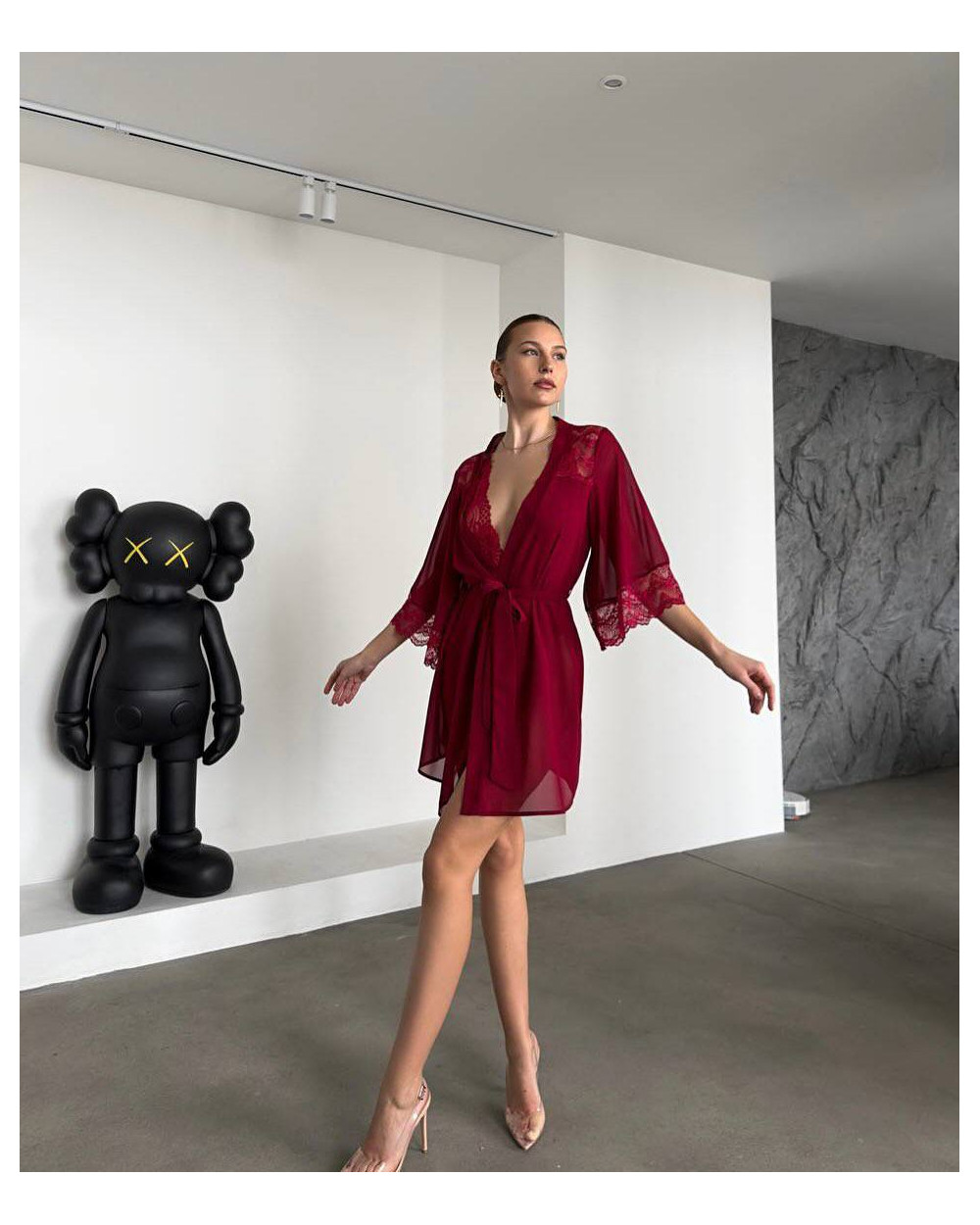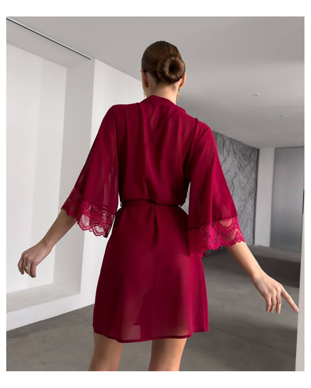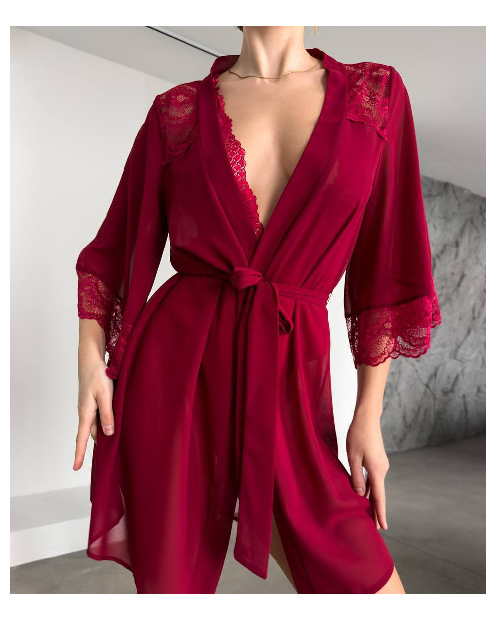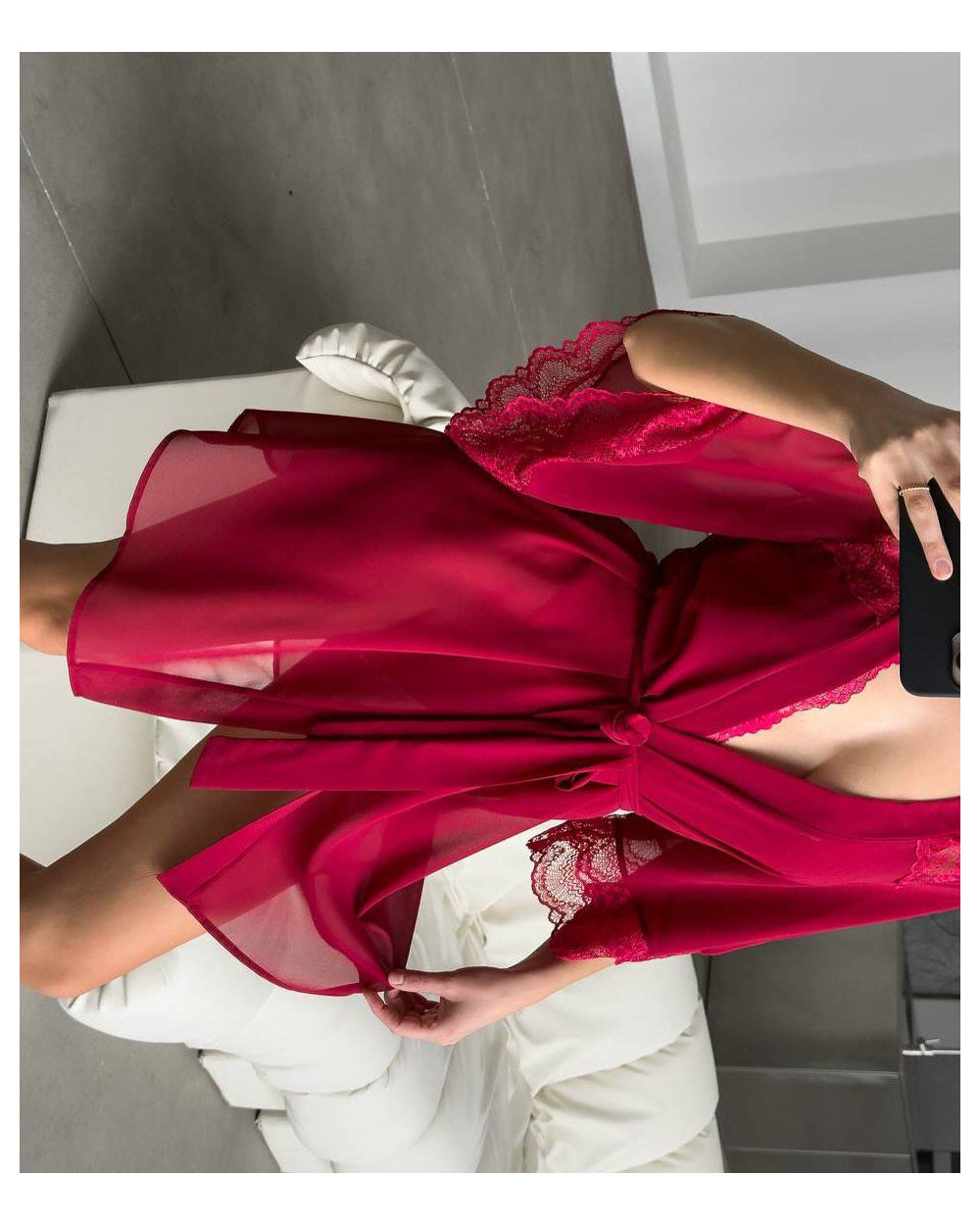 Halāts ir izgatavots no augstas kvalitātes smalka zīdaina tīkliņa, tāpēc tas ir īpaši maigs, viegls un patīkams ādai. Caurspīdīgā, ažūrā tekstūra piešķir tēlam vieglumu un romantiku, savukārt brīvais siluets skaisti krīt, izceļot ķermeņa līnijas.